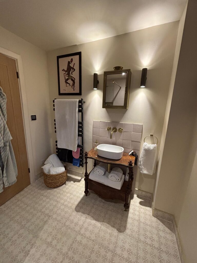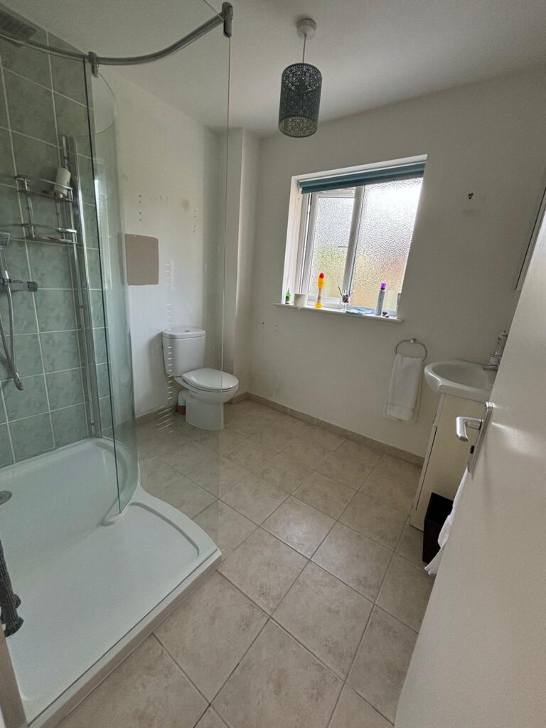 The transformation included expertly laid tiling in the kitchen and bathrooms, adding both durability and modern style. We installed a brand-new Howdens kitchen featuring custom units and integrated appliances, designed to be both functional and visually striking. The bathroom was also fully refurbished with contemporary fittings, a walk-in shower, and clever custom storage solutions.